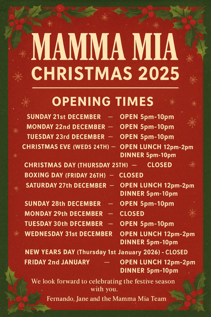 Established in 1987, Mamma Mia has a long-standing reputation for excellent and authentic Italian food, freshly prepared in our kitchens. Situated in the heart of York, the restaurant normally seats up to 70 people, and has a lovely secluded patio area seating an extra 40 however it is advisable to book to avoid disappointment especially on Friday and Saturday.